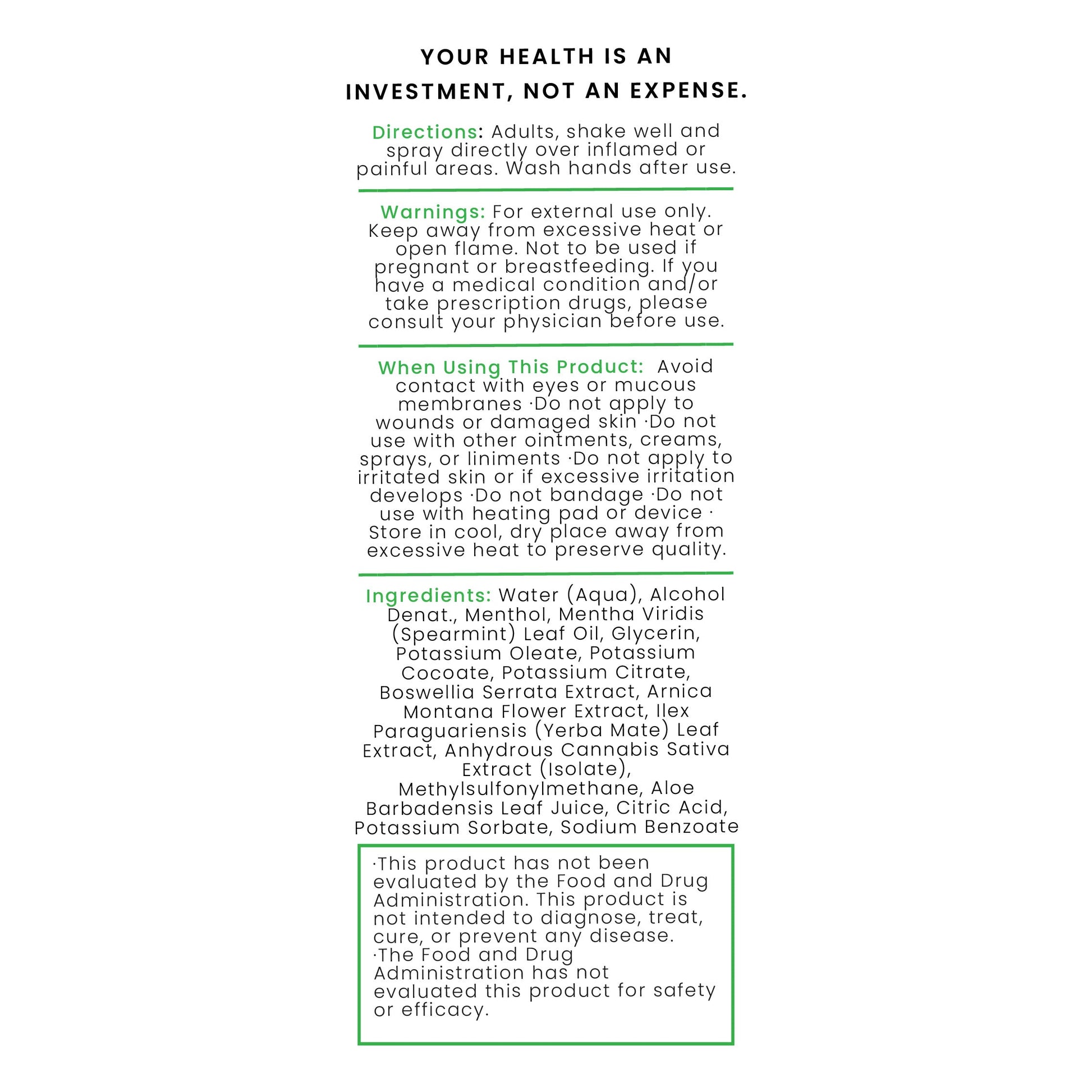 Directions: Adults, shake well and spray directly over inflamed or painful areas. Allow product to air dry or massage into skin. Use as needed throughout the day to relax muscles and help injuries recover. Use before, during or after activities for best results. Cooling sensation will activate in 2-5 minutes. Wash hands with soap and water after each use and enjoy the benefits of FlexCBD. Lock Cap to avoid misfire.