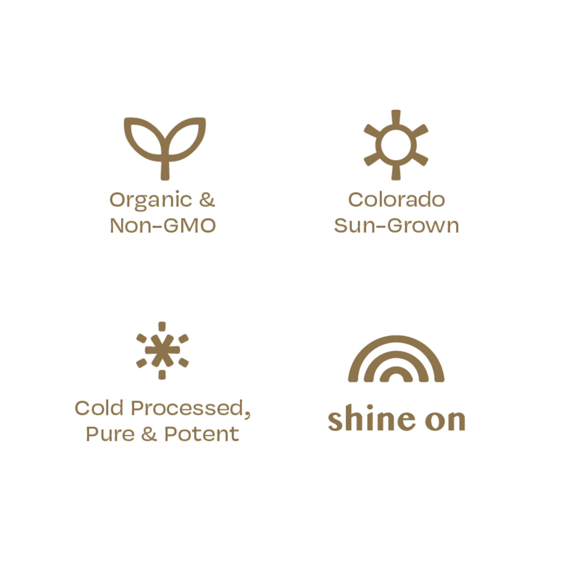 The key active ingredient is our exceptional hemp distillate. We manufacture our distillate using exclusively our very own organic hemp, which we grow lovingly in sunny Colorado, in a highly regenerative system. We then extract and distill it, using a proprietary organic cold processing method. The result is an incredibly efficacious distillate, with an unparalleled spectrum of actives.